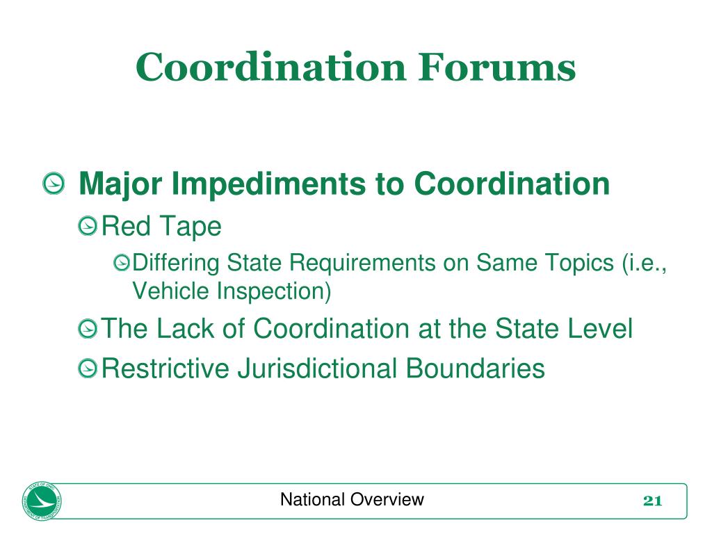 Coordination Forums National Overview • Major Impediments to Coordination • Red Tape • Differing State Requirements on Same Topics (i.e., Vehicle Inspection) • The Lack of Coordination at the State Level • Restrictive Jurisdictional Boundaries