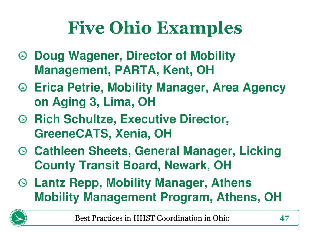 Five Ohio Examples • Doug Wagener, Director of Mobility Management, PARTA, Kent, OH • Erica Petrie, Mobility Manager, Area Agency on Aging 3, Lima, OH • Rich Schultze, Executive Director, GreeneCATS, Xenia, OH • Cathleen Sheets, General Manager, Licking County Transit Board, Newark, OH • Lantz Repp, Mobility Manager, Athens Mobility Management Program, Athens, OH Best Practices in HHST Coordination in Ohio