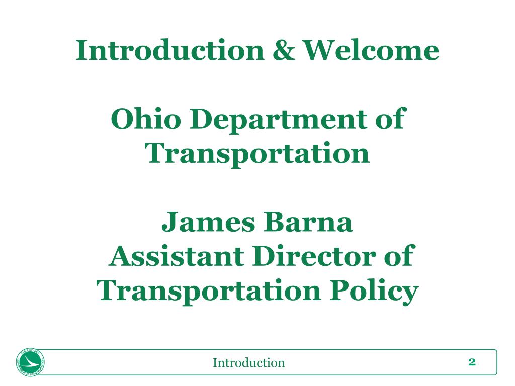 Introduction & WelcomeOhio Department of TransportationJames Barna Assistant Director ofTransportation Policy Introduction