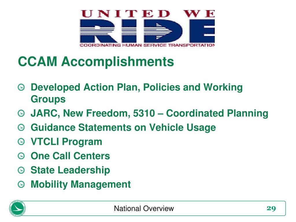 CCAM Accomplishments Developed Action Plan, Policies and Working Groups JARC, New Freedom, 5310 – Coordinated Planning Guidance Statements on Vehicle Usage VTCLI Program One Call Centers State Leadership Mobility Management National Overview
