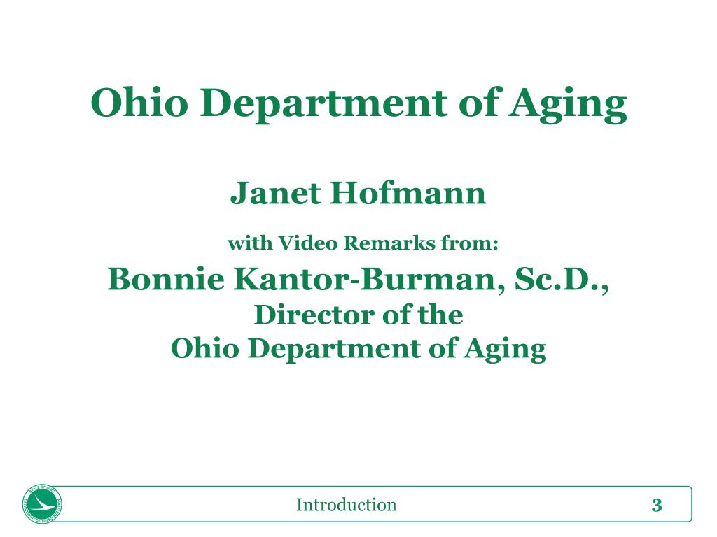Ohio Department of AgingJanet Hofmannwith Video Remarks from:Bonnie Kantor‐Burman, Sc.D., Director of the Ohio Department of Aging Introduction