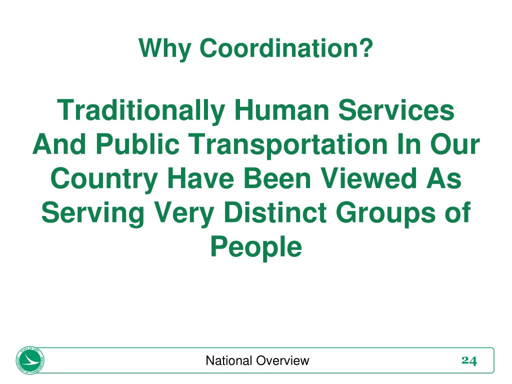 Why Coordination? Traditionally Human Services And Public Transportation In Our Country Have Been Viewed As Serving Very Distinct Groups of People National Overview
