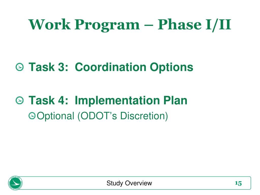 Work Program – Phase I/II • Task 3: Coordination Options • Task 4: Implementation Plan • Optional (ODOT’s Discretion) Study Overview