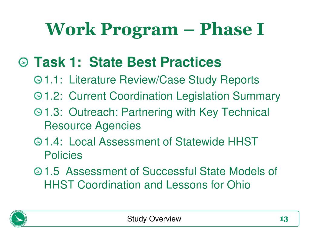 Work Program – Phase I • Task 1: State Best Practices • 1.1: Literature Review/Case Study Reports • 1.2: Current Coordination Legislation Summary • 1.3: Outreach: Partnering with Key Technical Resource Agencies • 1.4: Local Assessment of Statewide HHST Policies • 1.5 Assessment of Successful State Models of HHST Coordination and Lessons for Ohio Study Overview