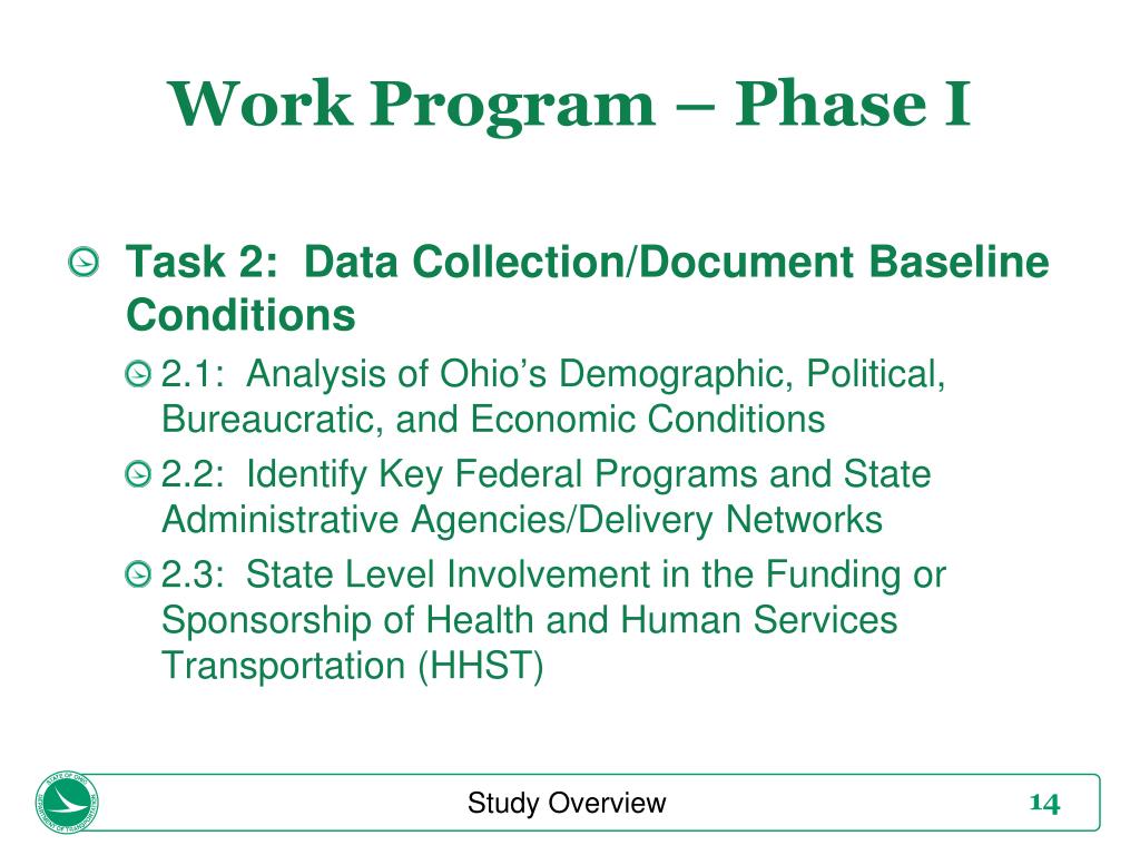 Work Program – Phase I • Task 2: Data Collection/Document Baseline Conditions • 2.1: Analysis of Ohio’s Demographic, Political, Bureaucratic, and Economic Conditions • 2.2: Identify Key Federal Programs and State Administrative Agencies/Delivery Networks • 2.3: State Level Involvement in the Funding or Sponsorship of Health and Human Services Transportation (HHST) Study Overview