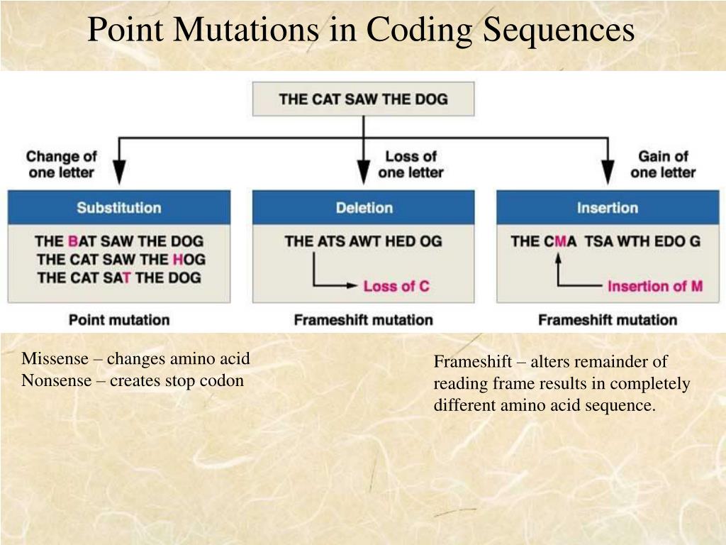 Point Mutations in Coding Sequences Missense – changes amino acid Nonsense – creates stop codon Frameshift – alters remainder of reading frame results in completely different amino acid sequence.