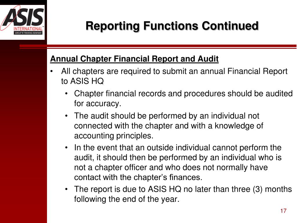 Reporting Functions Continued Annual Chapter Financial Report and Audit • All chapters are required to submit an annual Financial Report to ASIS HQ • Chapter financial records and procedures should be audited for accuracy. • The audit should be performed by an individual not connected with the chapter and with a knowledge of accounting principles. • In the event that an outside individual cannot perform the audit, it should then be performed by an individual who is not a chapter officer and who does not normally have contact with the chapter’s finances. • The report is due to ASIS HQ no later than three (3) months following the end of the year.