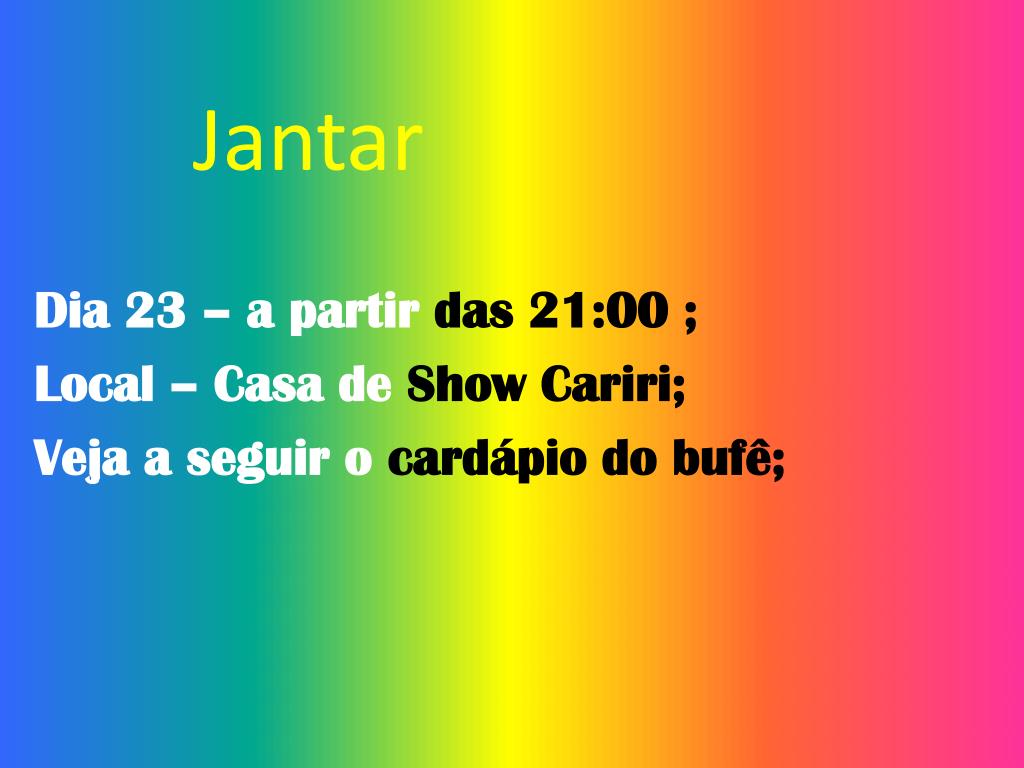 Jantar Dia 23 – a partir das 21:00 ; Local – Casa de Show Cariri; Veja a seguir o cardápio do bufê;