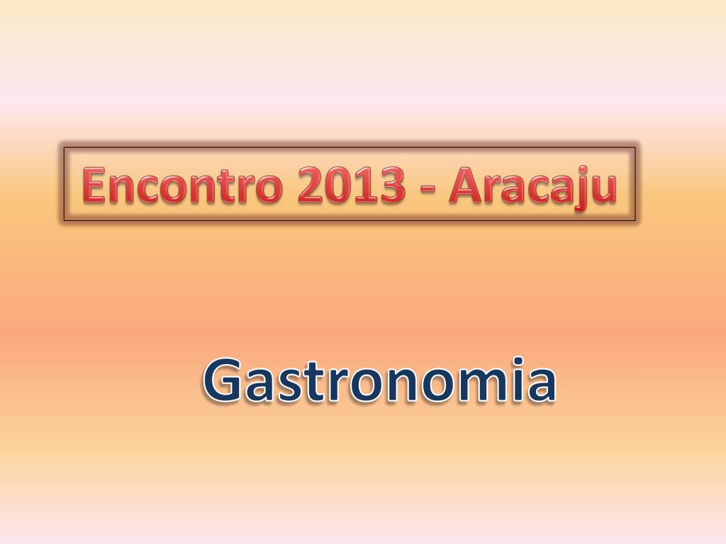 Encontro 2013 - Aracaju. Gastronomia. ENCONTRO 2013. ATUALIZAÇÃO DAS INSCRIÇÕES; ALTERAÇÕES NA PROGRAMAÇÃO ( Veja em amarelo nos slides da programação); GASTRONOMIA. RELAÇÃO DE INSCRITOS EM 17/MAR 13. NEREU E AILCE JJ DUTRA E JONIA JOSE CELSO E TANIA F WILSON E GLAÚCIA