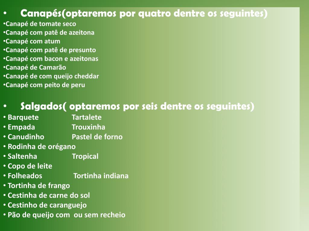 Canapés(optaremos por quatro dentre os seguintes) Canapé de tomate seco Canapé com patê de azeitona Canapé com atum Canapé com patê de presunto Canapé com bacon e azeitonas Canapé de Camarão Canapé de com queijo cheddar Canapé com peito de peru Salgados( optaremos por seis dentre os seguintes) Barquete Tartalete Empada Trouxinha Canudinho Pastel de forno Rodinha de orégano Saltenha Tropical Copo de leite Folheados Tortinha indiana Tortinha de frango Cestinha de carne do sol Cestinho de caranguejo Pão de queijo com ou sem recheio