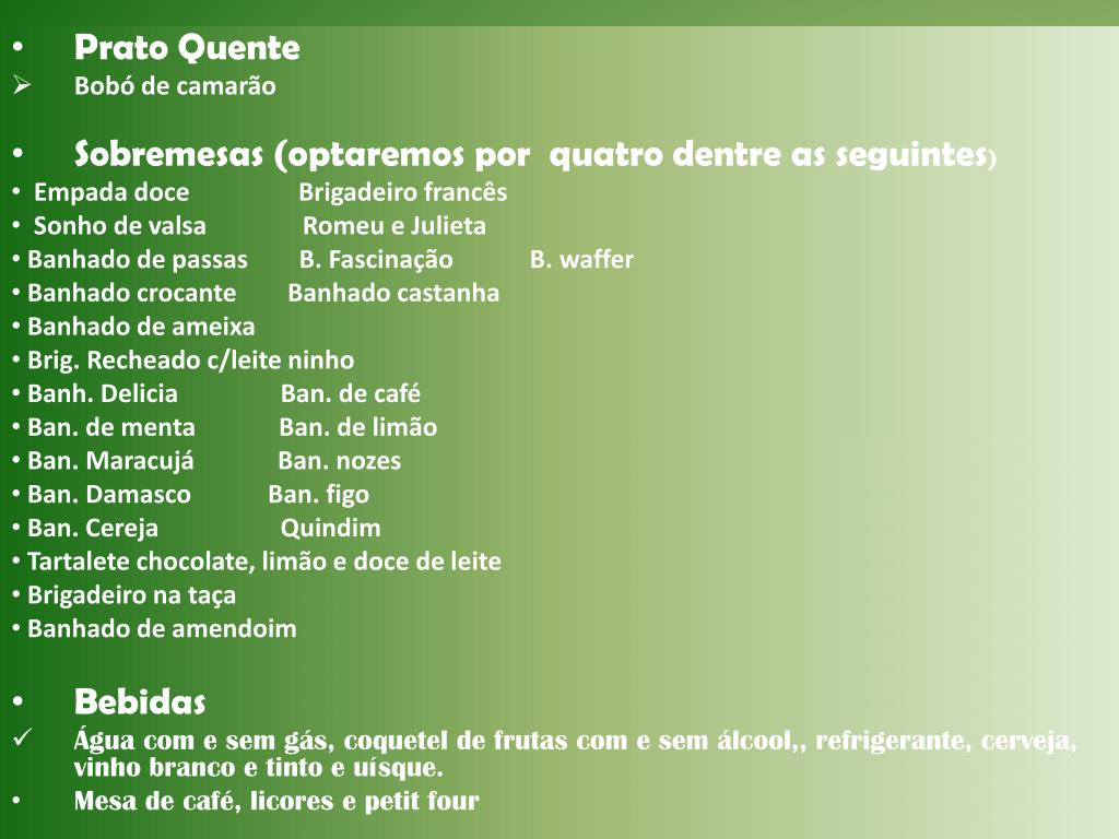 Prato Quente Bobó de camarão Sobremesas (optaremos por quatro dentre as seguintes) Empada doce Brigadeiro francês Sonho de valsa Romeu e Julieta Banhado de passas B. Fascinação B. waffer Banhado crocante Banhado castanha Banhado de ameixa Brig. Recheado c/leite ninho Banh. Delicia Ban. de café Ban. de menta Ban. de limão Ban. Maracujá Ban. nozes Ban. Damasco Ban. figo Ban. Cereja Quindim Tartalete chocolate, limão e doce de leite Brigadeiro na taça Banhado de amendoim Bebidas Água com e sem gás, coquetel de frutas com e sem álcool,, refrigerante, cerveja, vinho branco e tinto e uísque. Mesa de café, licores e petit four