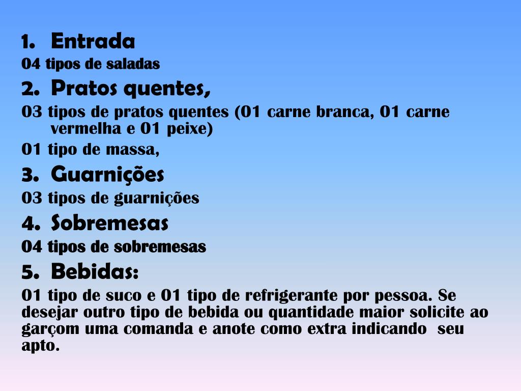 Entrada 04 tipos de saladas Pratos quentes, 03 tipos de pratos quentes (01 carne branca, 01 carne vermelha e 01 peixe) 01 tipo de massa, Guarnições 03 tipos de guarnições Sobremesas 04 tipos de sobremesas Bebidas: 01 tipo de suco e 01 tipo de refrigerante por pessoa. Se desejar outro tipo de bebida ou quantidade maior solicite ao garçom uma comanda e anote como extra indicando seu apto.