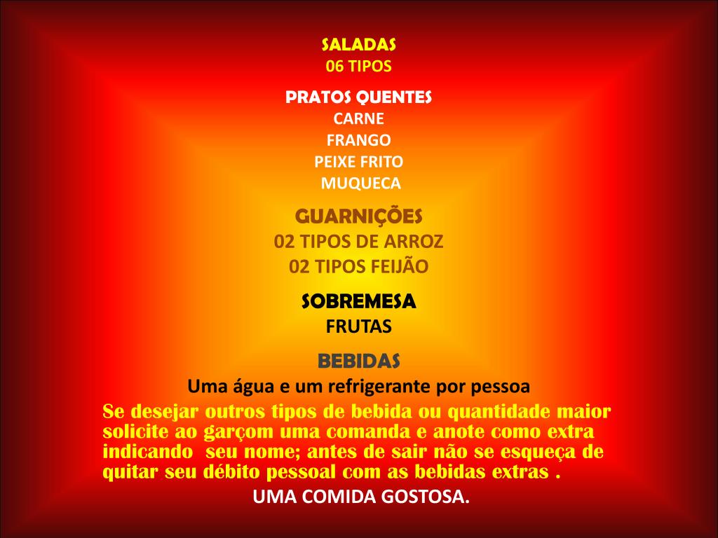SALADAS 06 TIPOS PRATOS QUENTES CARNE FRANGO PEIXE FRITO MUQUECA GUARNIÇÕES 02 TIPOS DE ARROZ 02 TIPOS FEIJÃO SOBREMESA FRUTAS BEBIDAS Uma água e um refrigerante por pessoa Se desejar outros tipos de bebida ou quantidade maior solicite ao garçom uma comanda e anote como extra indicando seu nome; antes de sair não se esqueça de quitar seu débito pessoal com as bebidas extras . UMA COMIDA GOSTOSA.