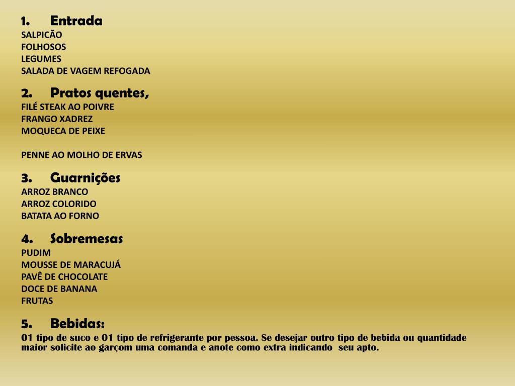 Entrada SALPICÃO FOLHOSOS LEGUMES SALADA DE VAGEM REFOGADA Pratos quentes, FILÉ STEAK AO POIVRE FRANGO XADREZ MOQUECA DE PEIXE PENNE AO MOLHO DE ERVAS Guarnições ARROZ BRANCO ARROZ COLORIDO BATATA AO FORNO Sobremesas PUDIM MOUSSE DE MARACUJÁ PAVÊ DE CHOCOLATE DOCE DE BANANA FRUTAS Bebidas: 01 tipo de suco e 01 tipo de refrigerante por pessoa. Se desejar outro tipo de bebida ou quantidade maior solicite ao garçom uma comanda e anote como extra indicando seu apto.