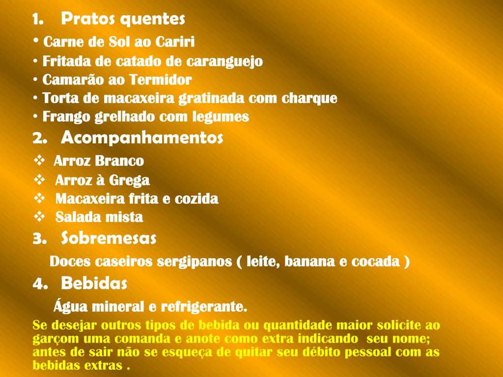Pratos quentes Carne de Sol ao Cariri Fritada de catado de caranguejo Camarão ao Termidor Torta de macaxeira gratinada com charque Frango grelhado com legumes Acompanhamentos Arroz Branco Arroz à Grega Macaxeira frita e cozida Salada mista Sobremesas Doces caseiros sergipanos ( leite, banana e cocada ) Bebidas Água mineral e refrigerante. Se desejar outros tipos de bebida ou quantidade maior solicite ao garçom uma comanda e anote como extra indicando seu nome; antes de sair não se esqueça de quitar seu débito pessoal com as bebidas extras .