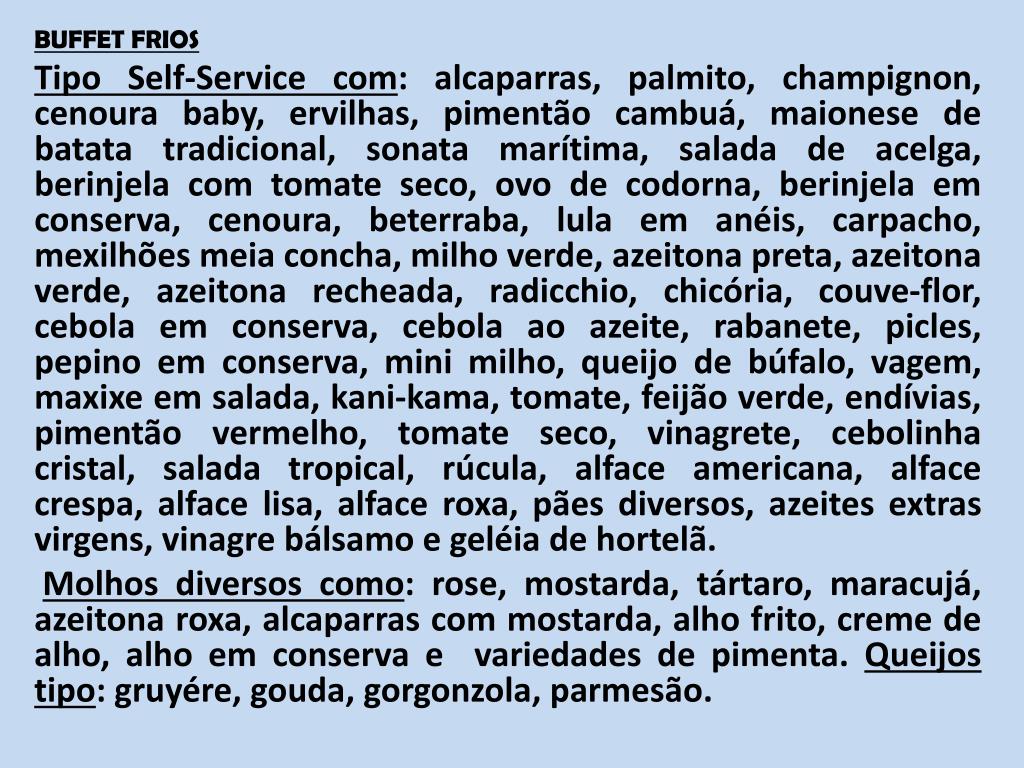 BUFFET FRIOS Tipo Self-Service com: alcaparras, palmito, champignon, cenoura baby, ervilhas, pimentão cambuá, maionese de batata tradicional, sonata marítima, salada de acelga, berinjela com tomate seco, ovo de codorna, berinjela em conserva, cenoura, beterraba, lula em anéis, carpacho, mexilhões meia concha, milho verde, azeitona preta, azeitona verde, azeitona recheada, radicchio, chicória, couve-flor, cebola em conserva, cebola ao azeite, rabanete, picles, pepino em conserva, mini milho, queijo de búfalo, vagem, maxixe em salada, kani-kama, tomate, feijão verde, endívias, pimentão vermelho, tomate seco, vinagrete, cebolinha cristal, salada tropical, rúcula, alface americana, alface crespa, alface lisa, alface roxa, pães diversos, azeites extras virgens, vinagre bálsamo e geléia de hortelã. Molhos diversos como: rose, mostarda, tártaro, maracujá, azeitona roxa, alcaparras com mostarda, alho frito, creme de alho, alho em conserva e variedades de pimenta. Queijos tipo: gruyére, gouda, gorgonzola, parmesão.