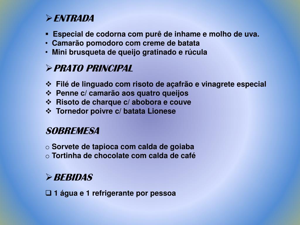 ENTRADA • Especial de codorna com purê de inhame e molho de uva. • Camarão pomodoro com creme de batata • Mini brusqueta de queijo gratinado e rúcula • PRATO PRINCIPAL • Filé de linguado com risoto de açafrão e vinagrete especial • Penne c/ camarão aos quatro queijos • Risoto de charque c/ abobora e couve • Tornedor poivre c/ batata Lionese • SOBREMESA • Sorvete de tapioca com calda de goiaba • Tortinha de chocolate com calda de café • BEBIDAS • 1 água e 1 refrigerante por pessoa