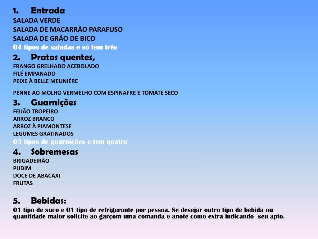 Entrada SALADA VERDE SALADA DE MACARRÃO PARAFUSO SALADA DE GRÃO DE BICO 04 tipos de saladas e só tem três Pratos quentes, FRANGO GRELHADO ACEBOLADO FILÉ EMPANADO PEIXE À BELLE MEUNIÉRE PENNE AO MOLHO VERMELHO COM ESPINAFRE E TOMATE SECO Guarnições FEIJÃO TROPEIRO ARROZ BRANCO ARROZ À PIAMONTESE LEGUMES GRATINADOS 03 tipos de guarnições e tem quatro Sobremesas BRIGADEIRÃO PUDIM DOCE DE ABACAXI FRUTAS Bebidas: 01 tipo de suco e 01 tipo de refrigerante por pessoa. Se desejar outro tipo de bebida ou quantidade maior solicite ao garçom uma comanda e anote como extra indicando seu apto.