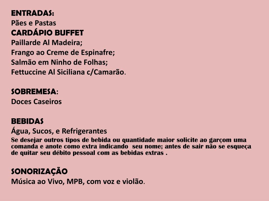 ENTRADAS: Pães e Pastas CARDÁPIO BUFFET Paillarde Al Madeira; Frango ao Creme de Espinafre; Salmão em Ninho de Folhas; Fettuccine Al Siciliana c/Camarão. SOBREMESA: Doces Caseiros BEBIDAS Água, Sucos, e Refrigerantes Se desejar outros tipos de bebida ou quantidade maior solicite ao garçom uma comanda e anote como extra indicando seu nome; antes de sair não se esqueça de quitar seu débito pessoal com as bebidas extras . SONORIZAÇÃO Música ao Vivo, MPB, com voz e violão.