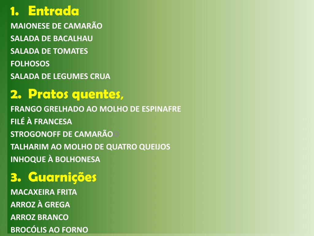 Entrada MAIONESE DE CAMARÃO SALADA DE BACALHAU SALADA DE TOMATES FOLHOSOS SALADA DE LEGUMES CRUA Pratos quentes, FRANGO GRELHADO AO MOLHO DE ESPINAFRE FILÉ À FRANCESA STROGONOFF DE CAMARÃOO TALHARIM AO MOLHO DE QUATRO QUEIJOS INHOQUE À BOLHONESA Guarnições MACAXEIRA FRITA ARROZ À GREGA ARROZ BRANCO BROCÓLIS AO FORNO