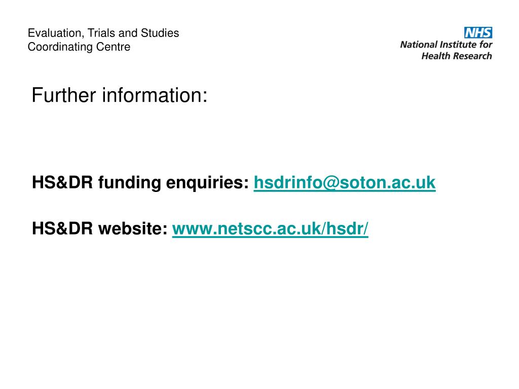 Further information: Evaluation, Trials and Studies Coordinating Centre HS&DR funding enquiries: hsdrinfo@soton.ac.uk HS&DR website: www.netscc.ac.uk/hsdr/