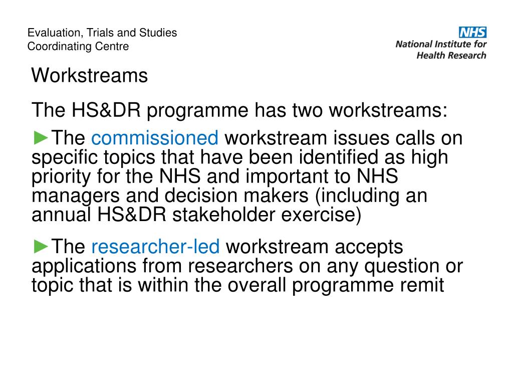 Workstreams Evaluation, Trials and Studies Coordinating Centre The HS&DR programme has two workstreams: • The commissioned workstream issues calls on specific topics that have been identified as high priority for the NHS and important to NHS managers and decision makers (including an annual HS&DR stakeholder exercise) • The researcher-led workstream accepts applications from researchers on any question or topic that is within the overall programme remit