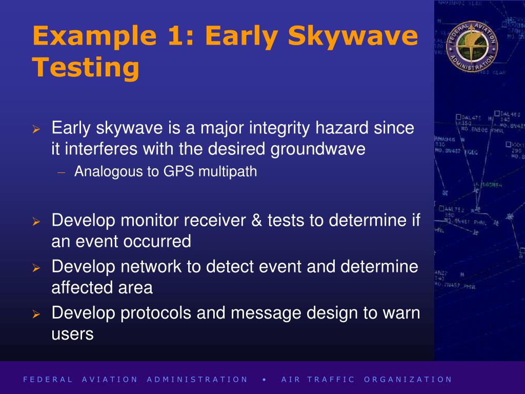 Example 1: Early Skywave Testing • Early skywave is a major integrity hazard since it interferes with the desired groundwave • Analogous to GPS multipath • Develop monitor receiver & tests to determine if an event occurred • Develop network to detect event and determine affected area • Develop protocols and message design to warn users