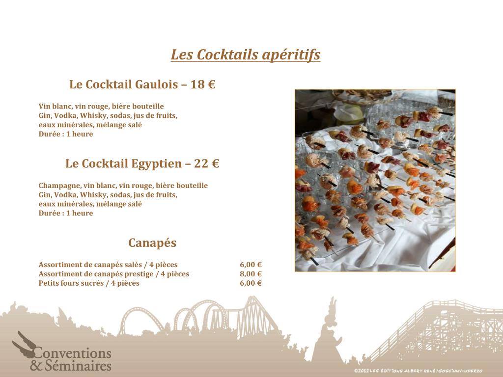 Les Cocktails apéritifs Le Cocktail Gaulois – 18 € Vin blanc, vin rouge, bière bouteille Gin, Vodka, Whisky, sodas, jus de fruits, eaux minérales, mélange salé Durée : 1 heure Le Cocktail Egyptien – 22 € Champagne, vin blanc, vin rouge, bière bouteille Gin, Vodka, Whisky, sodas, jus de fruits, eaux minérales, mélange salé Durée : 1 heure Canapés Assortiment de canapés salés / 4 pièces 6,00 € Assortiment de canapés prestige / 4 pièces 8,00 € Petits fours sucrés / 4 pièces 6,00 €