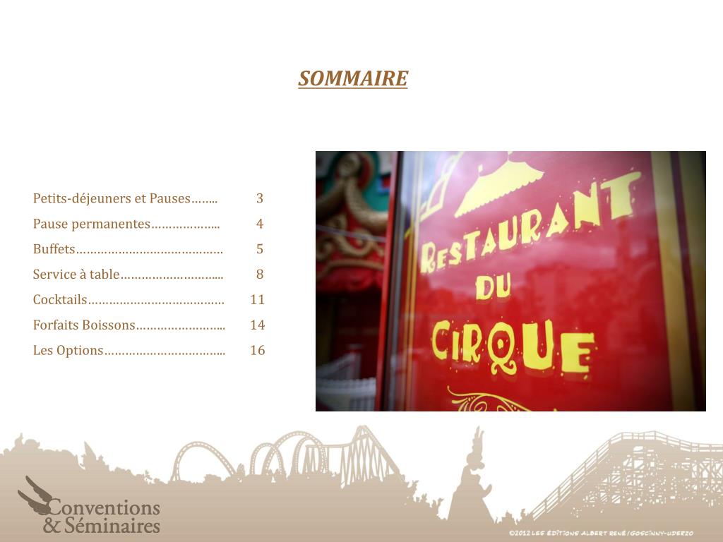 OFFRE RESTAURATION CONVENTIONS & SEMINAIRES 2013. SOMMAIRE. Petits-déjeuners et Pauses…….. 3 Pause permanentes……………….. 4 Buffets…………………………………… 5 Service à table………………………... 8 Cocktails………………………………… 11 Forfaits Boissons…………………….. 14 Les Options…………………………….. 16.