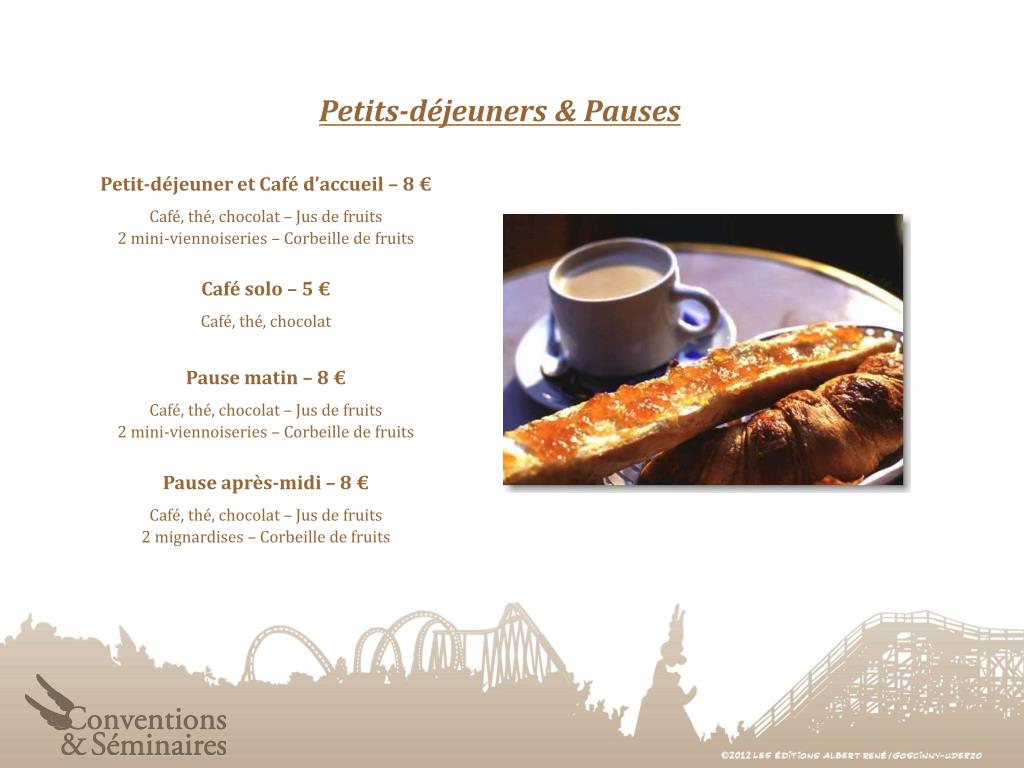 Petits-déjeuners & Pauses Petit-déjeuner et Café d’accueil – 8 € Café, thé, chocolat – Jus de fruits 2 mini-viennoiseries – Corbeille de fruits Café solo – 5 € Café, thé, chocolat Pause matin – 8 € Café, thé, chocolat – Jus de fruits 2 mini-viennoiseries – Corbeille de fruits Pause après-midi – 8 € Café, thé, chocolat – Jus de fruits 2 mignardises – Corbeille de fruits