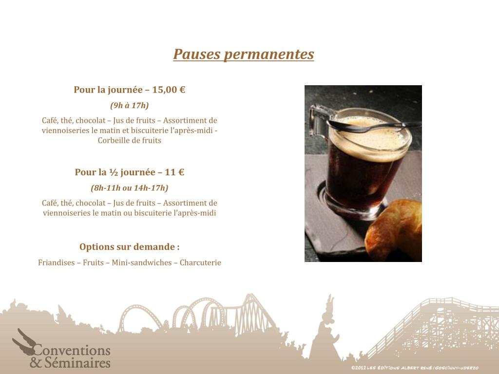 Pauses permanentes Pour la journée – 15,00 € (9h à 17h) Café, thé, chocolat – Jus de fruits – Assortiment de viennoiseries le matin et biscuiterie l’après-midi - Corbeille de fruits Pour la ½ journée – 11 € (8h-11h ou 14h-17h) Café, thé, chocolat – Jus de fruits – Assortiment de viennoiseries le matin ou biscuiterie l’après-midi Options sur demande : Friandises – Fruits – Mini-sandwiches – Charcuterie
