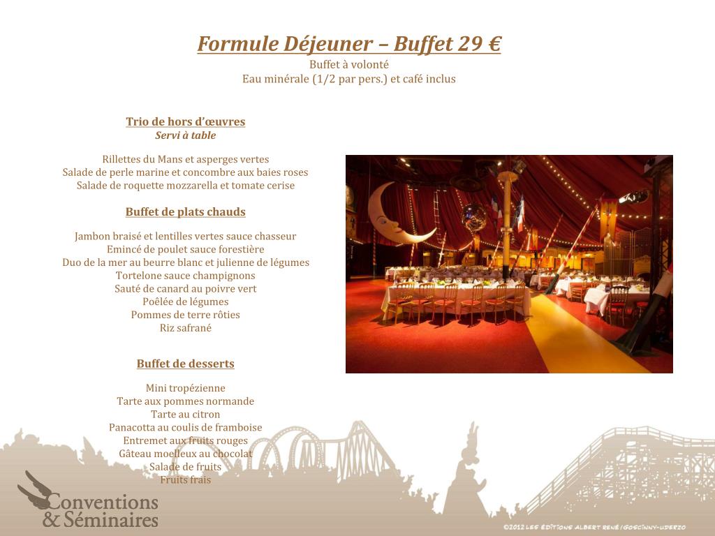 Formule Déjeuner – Buffet 29 € Buffet à volonté Eau minérale (1/2 par pers.) et café inclus Trio de hors d’œuvres Servi à table Rillettes du Mans et asperges vertes Salade de perle marine et concombre aux baies roses Salade de roquette mozzarella et tomate cerise Buffet de plats chauds Jambon braisé et lentilles vertes sauce chasseur Emincé de poulet sauce forestière Duo de la mer au beurre blanc et julienne de légumes Tortelone sauce champignons Sauté de canard au poivre vert Poêlée de légumes Pommes de terre rôties Riz safrané Buffet de desserts Mini tropézienne Tarte aux pommes normande Tarte au citron Panacotta au coulis de framboise Entremet aux fruits rouges Gâteau moelleux au chocolat Salade de fruits Fruits frais