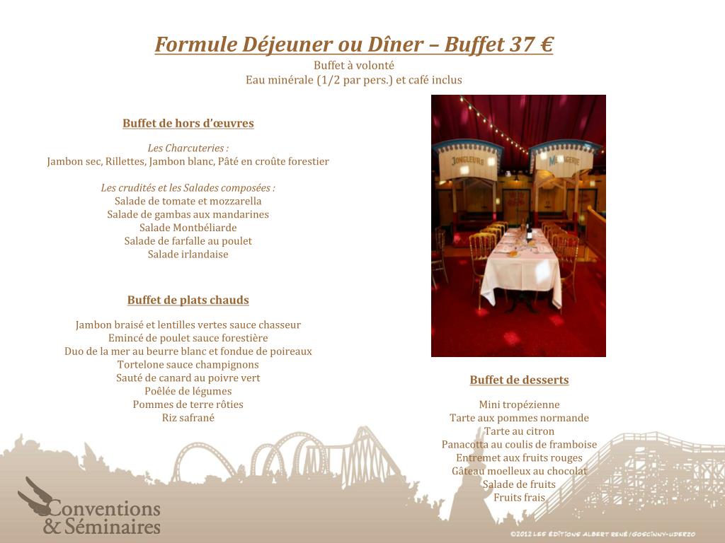 Formule Déjeuner ou Dîner – Buffet 37 € Buffet à volonté Eau minérale (1/2 par pers.) et café inclus Buffet de hors d’œuvres Les Charcuteries : Jambon sec, Rillettes, Jambon blanc, Pâté en croûte forestier Les crudités et les Salades composées : Salade de tomate et mozzarella Salade de gambas aux mandarines Salade Montbéliarde Salade de farfalle au poulet Salade irlandaise Buffet de plats chauds Jambon braisé et lentilles vertes sauce chasseur Emincé de poulet sauce forestière Duo de la mer au beurre blanc et fondue de poireaux Tortelone sauce champignons Sauté de canard au poivre vert Poêlée de légumes Pommes de terre rôties Riz safrané Buffet de desserts Mini tropézienne Tarte aux pommes normande Tarte au citron Panacotta au coulis de framboise Entremet aux fruits rouges Gâteau moelleux au chocolat Salade de fruits Fruits frais