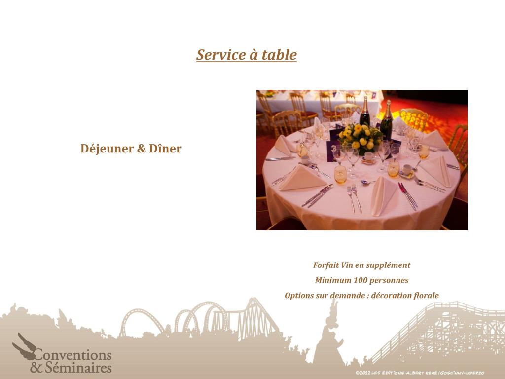 Service à table Déjeuner & Dîner Forfait Vin en supplément Minimum 100 personnes Options sur demande : décoration florale
