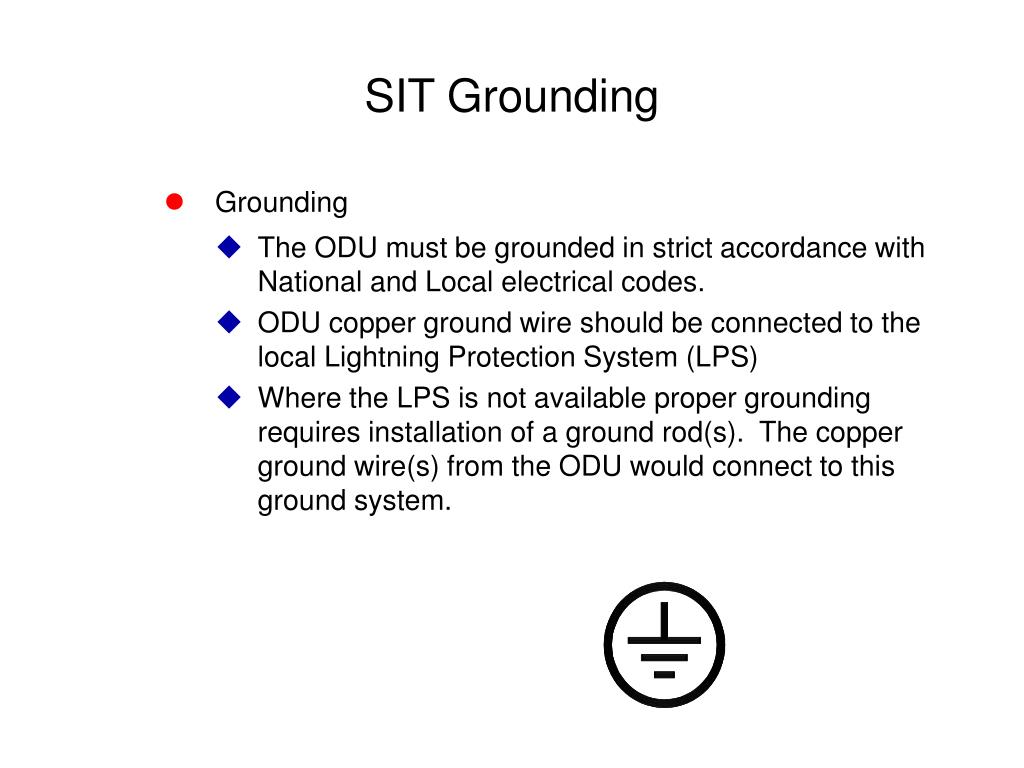 SIT Grounding • Grounding • The ODU must be grounded in strict accordance with National and Local electrical codes. • ODU copper ground wire should be connected to the local Lightning Protection System (LPS) • Where the LPS is not available proper grounding requires installation of a ground rod(s). The copper ground wire(s) from the ODU would connect to this ground system.
