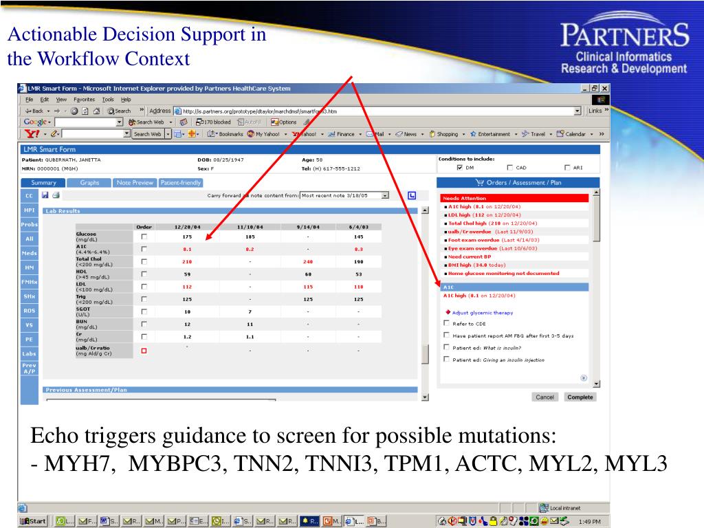 Actionable Decision Support inthe Workflow Context Echo triggers guidance to screen for possible mutations: - MYH7, MYBPC3, TNN2, TNNI3, TPM1, ACTC, MYL2, MYL3