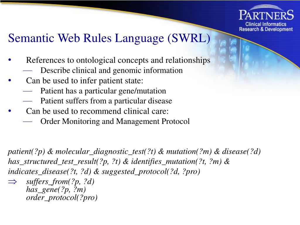 Semantic Web Rules Language (SWRL) • References to ontological concepts and relationships • Describe clinical and genomic information • Can be used to infer patient state: • Patient has a particular gene/mutation • Patient suffers from a particular disease • Can be used to recommend clinical care: • Order Monitoring and Management Protocol patient(?p) & molecular_diagnostic_test(?t) & mutation(?m) & disease(?d) has_structured_test_result(?p, ?t) & identifies_mutation(?t, ?m) & indicates_disease(?t, ?d) & suggested_protocol(?d, ?pro) • suffers_from(?p, ?d)has_gene(?p, ?m)order_protocol(?pro)