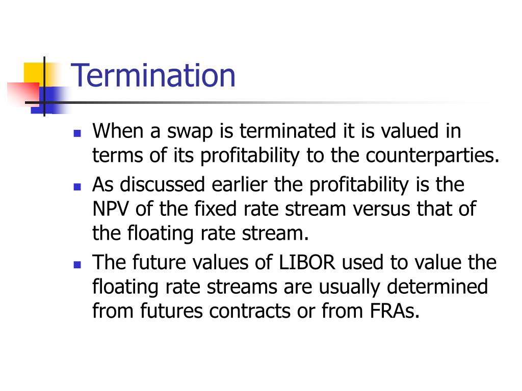 Termination • When a swap is terminated it is valued in terms of its profitability to the counterparties. • As discussed earlier the profitability is the NPV of the fixed rate stream versus that of the floating rate stream. • The future values of LIBOR used to value the floating rate streams are usually determined from futures contracts or from FRAs.
