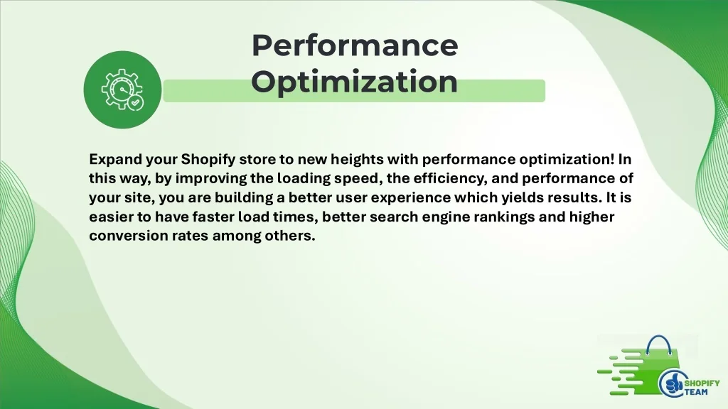 Performance Optimization Expand your Shopify store to new heights with performance optimization! In this way, by improving the loading speed, the efficiency, and performance of your site, you are building a better user experience which yields results. It is easier to have faster load times, better search engine rankings and higher conversion rates among others.