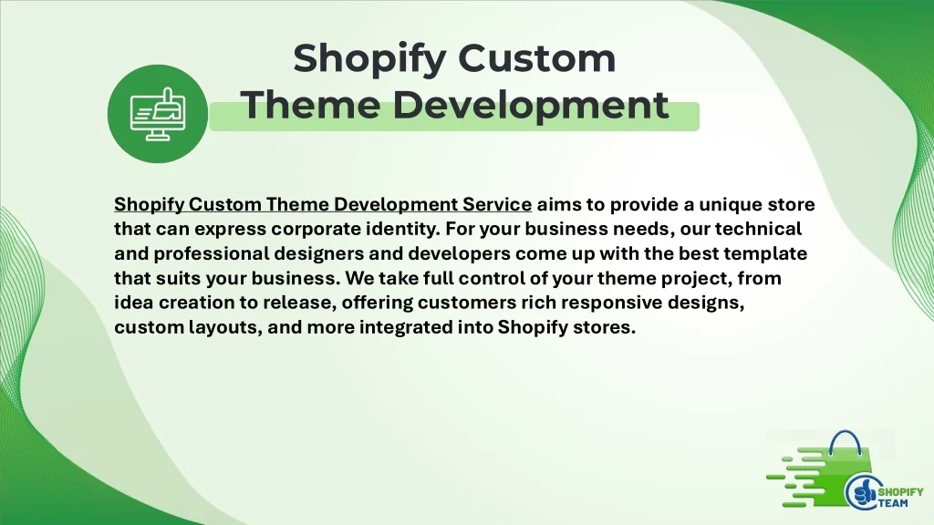 Shopify Custom Theme Development Shopify Custom Theme Development Service aims to provide a unique store that can express corporate identity. For your business needs, our technical and professional designers and developers come up with the best template that suits your business. We take full control of your theme project, from idea creation to release, offering customers rich responsive designs, custom layouts, and more integrated into Shopify stores.