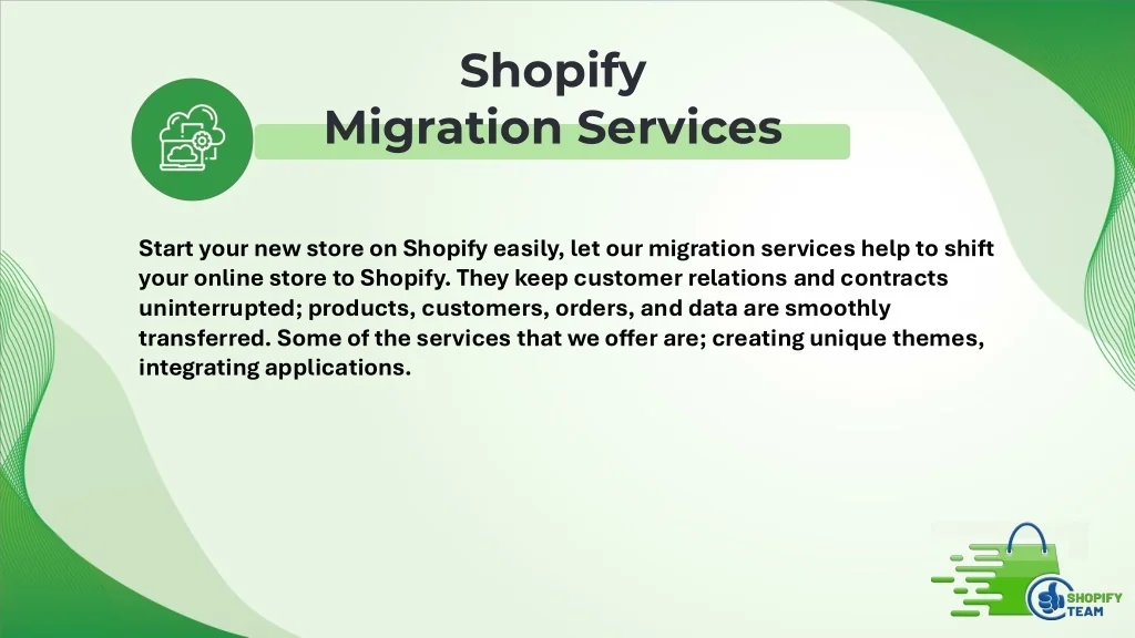 Shopify Migration Services Start your new store on Shopify easily, let our migration services help to shift your online store to Shopify. They keep customer relations and contracts uninterrupted; products, customers, orders, and data are smoothly transferred. Some of the services that we offer are; creating unique themes, integrating applications.