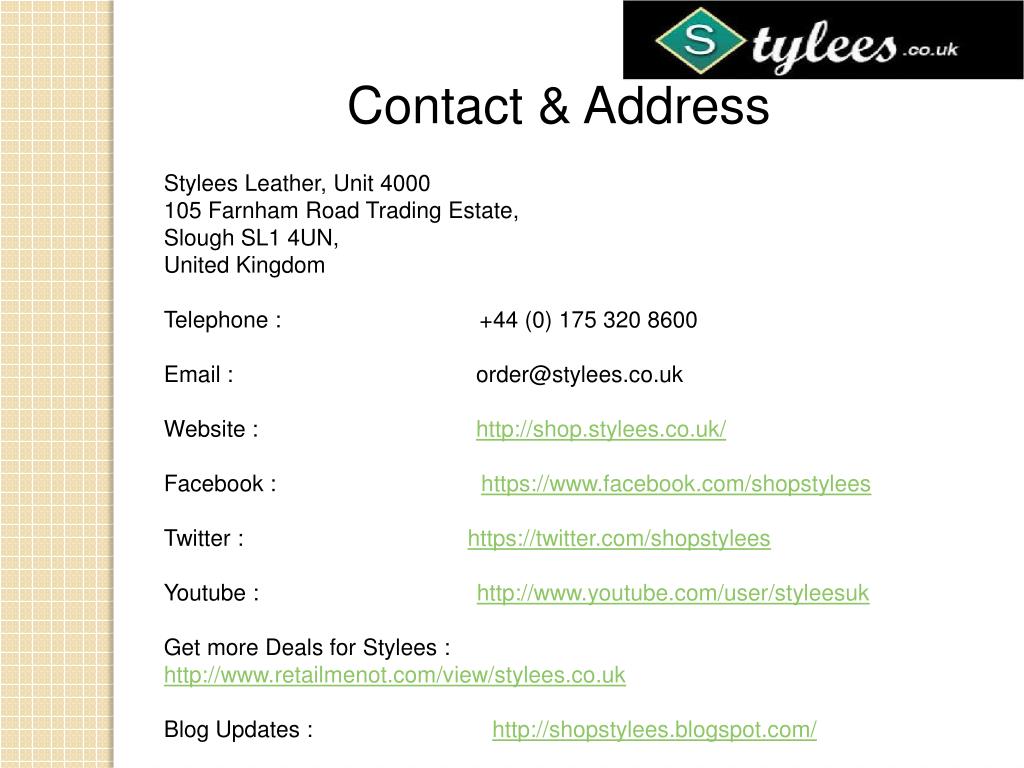 Contact & Address Stylees Leather, Unit 4000 105 Farnham Road Trading Estate, Slough SL1 4UN, United Kingdom Telephone : +44 (0) 175 320 8600 Email : order@stylees.co.uk Website : http://shop.stylees.co.uk/ Facebook : https://www.facebook.com/shopstylees Twitter : https://twitter.com/shopstylees Youtube : http://www.youtube.com/user/styleesuk Get more Deals for Stylees : http://www.retailmenot.com/view/stylees.co.uk Blog Updates : http://shopstylees.blogspot.com/