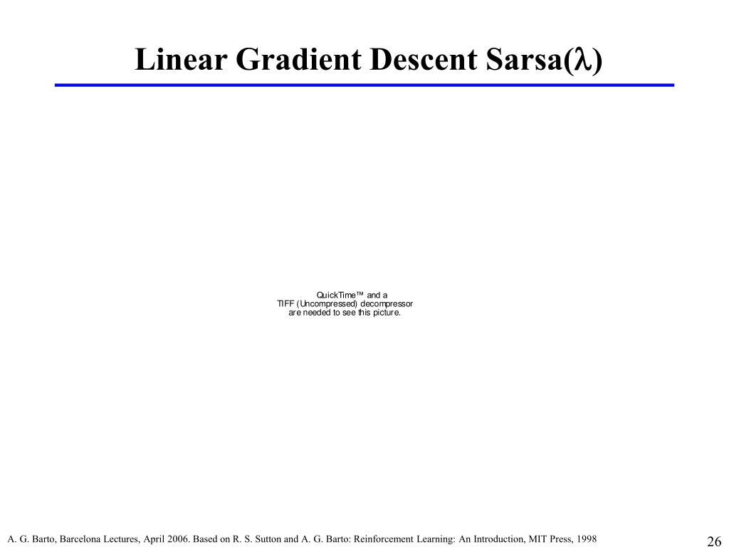 Linear Gradient Descent Sarsa(l) A. G. Barto, Barcelona Lectures, April 2006. Based on R. S. Sutton and A. G. Barto: Reinforcement Learning: An Introduction, MIT Press, 1998