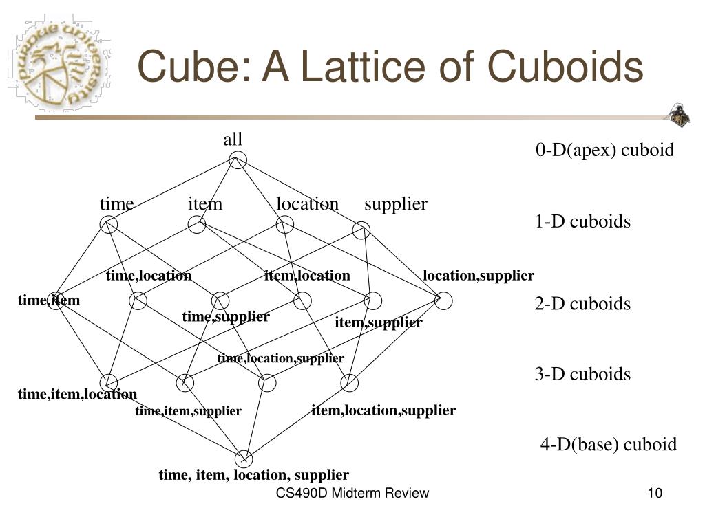 Cube: A Lattice of Cuboids all 0-D(apex) cuboid time item location supplier 1-D cuboids time,location item,location location,supplier time,item 2-D cuboids time,supplier item,supplier time,location,supplier 3-D cuboids time,item,location item,location,supplier time,item,supplier 4-D(base) cuboid time, item, location, supplier CS490D Midterm Review