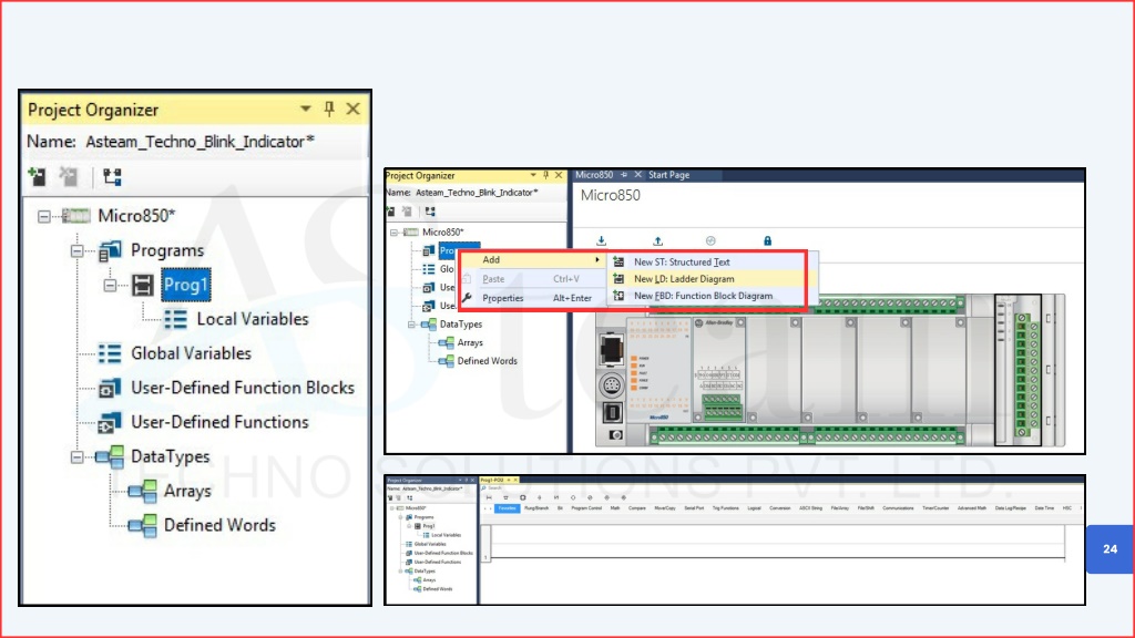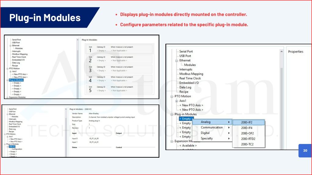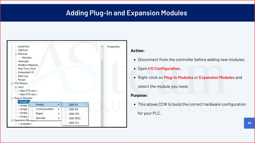 Adding Plug-In and Expansion Modules Action: Disconnect from the controller before adding new modules. Open I/O Configuration. Right-click on Plug-in Modules or Expansion Modules and select the module you need. Purpose: This allows CCW to build the correct hardware configuration for your PLC. 06