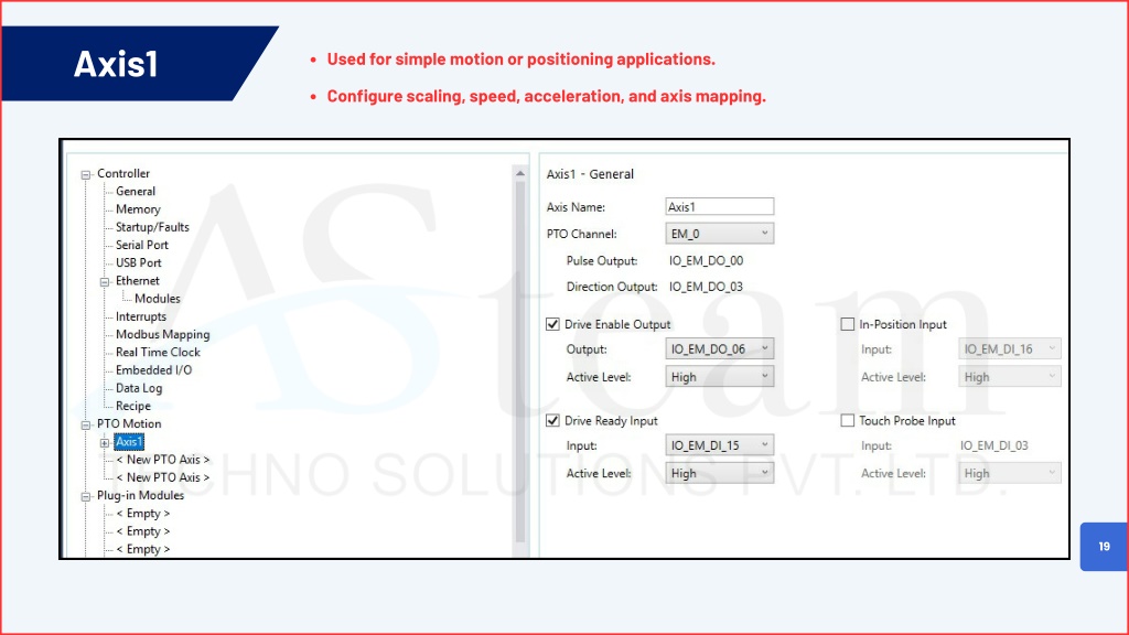 Axis1 Used for simple motion or positioning applications. Configure scaling, speed, acceleration, and axis mapping. 19