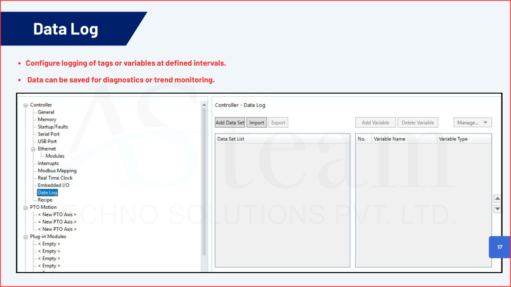 Data Log Configure logging of tags or variables at defined intervals. Data can be saved for diagnostics or trend monitoring. 17