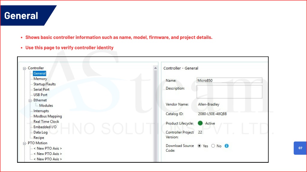 General Shows basic controller information such as name, model, firmware, and project details. Use this page to verify controller identity 07