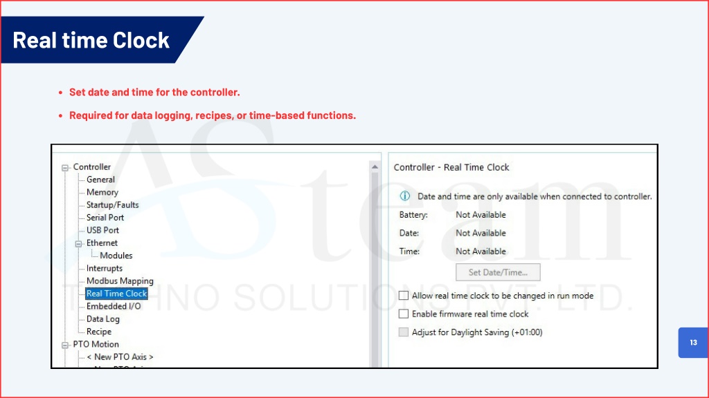 Real time Clock Set date and time for the controller. Required for data logging, recipes, or time-based functions. 13
