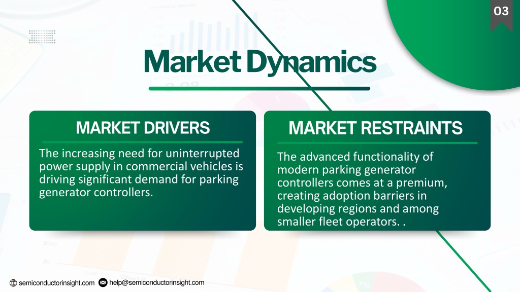 4. help@semiconductorinsight.com semiconductorinsight.com MARKET RESTRAINTS MARKET DRIVERS 03 Market Dynamics The increasing need for uninterrupted power supply in commercial vehicles is driving significant demand for parking generator controllers. The advanced functionality of modern parking generator controllers comes at a premium, creating adoption barriers in developing regions and among smaller fleet operators. .
